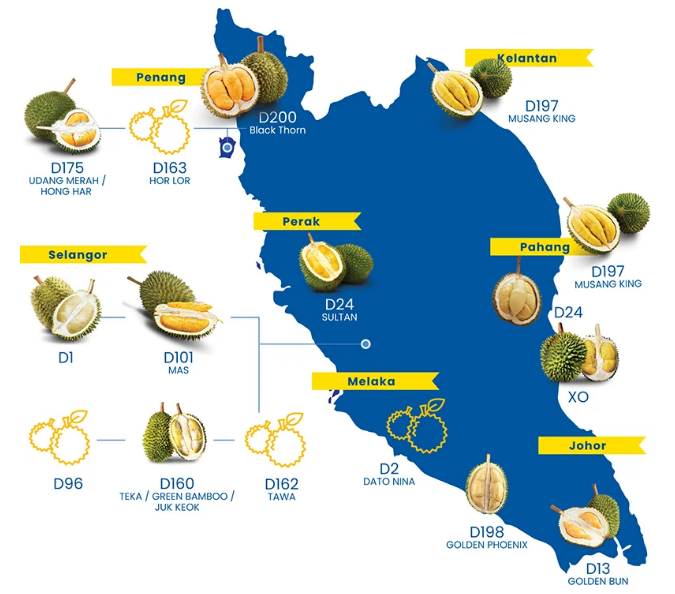 在馬來西亞,大約有200個(gè)榴蓮品種有自己獨(dú)特的風(fēng)味和香氣。同時(shí)它們也對適宜的生長條件也特定的需要,例如降雨,海拔,溫度和土壤結(jié)構(gòu)。榴蓮僅在成熟季節(jié)才有供應(yīng)那發(fā)生在每年的六月和七月。那個(gè)時(shí)節(jié)成熟后從樹上自然掉落的榴蓮,往往會(huì)含有較多的果肉和更濃郁的香氣。
